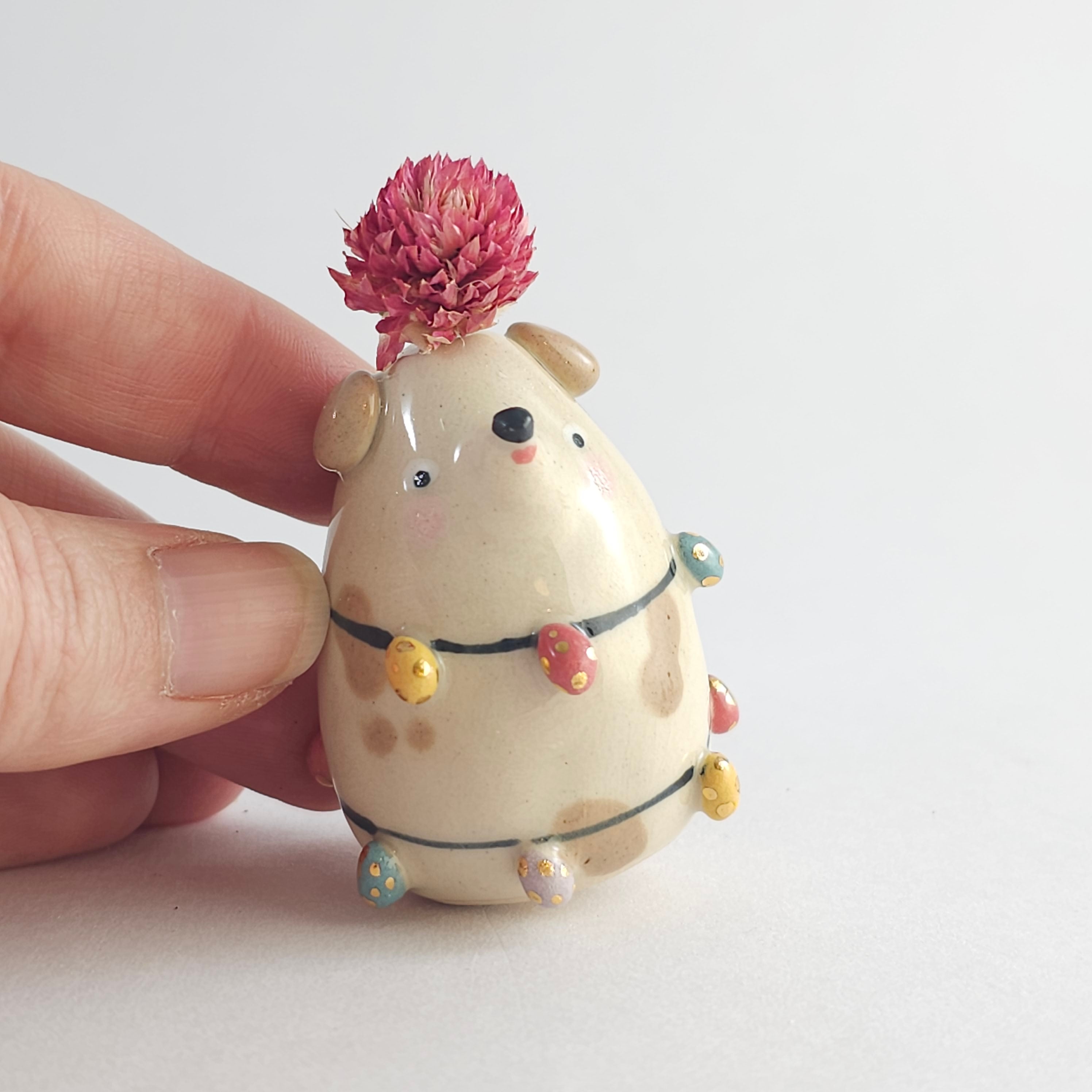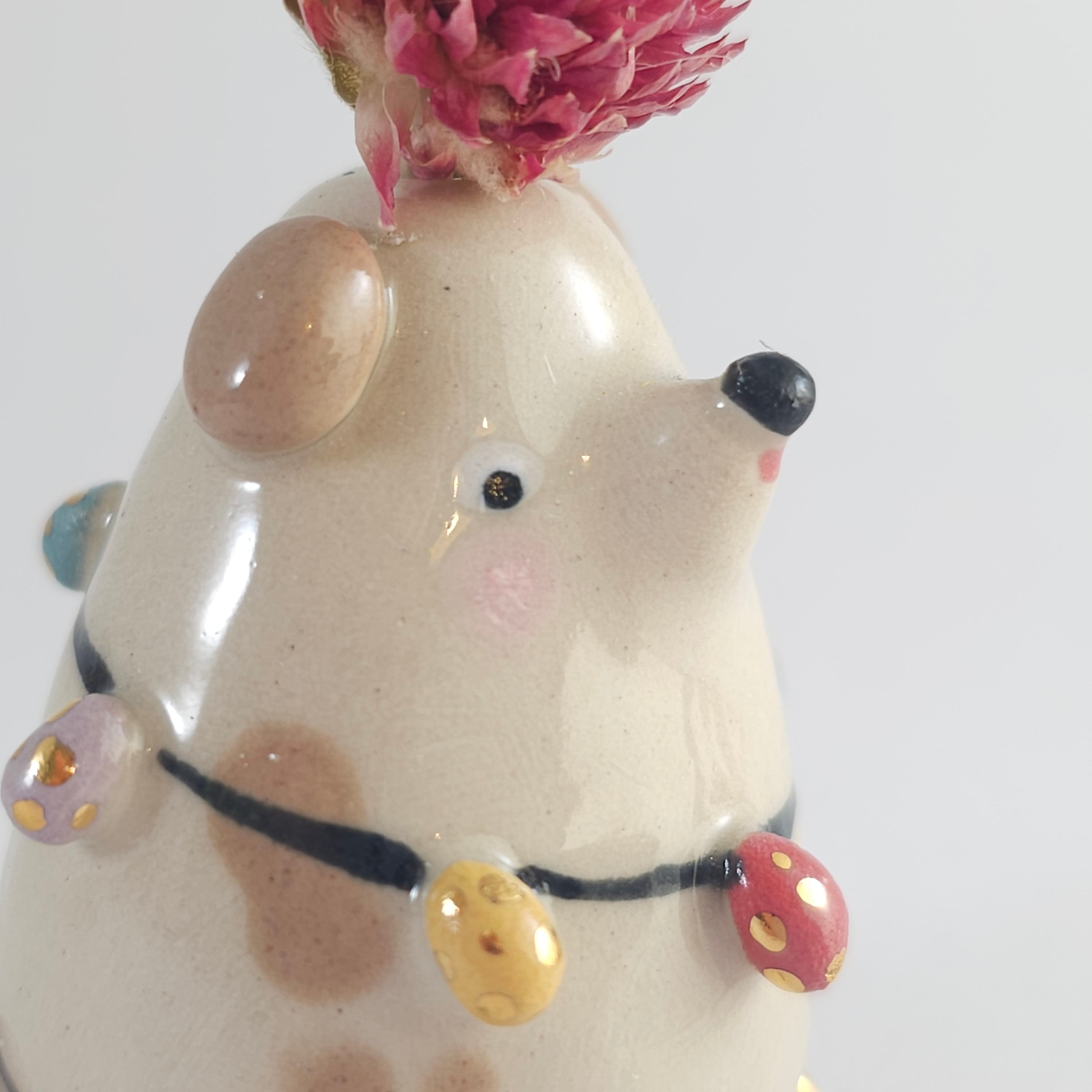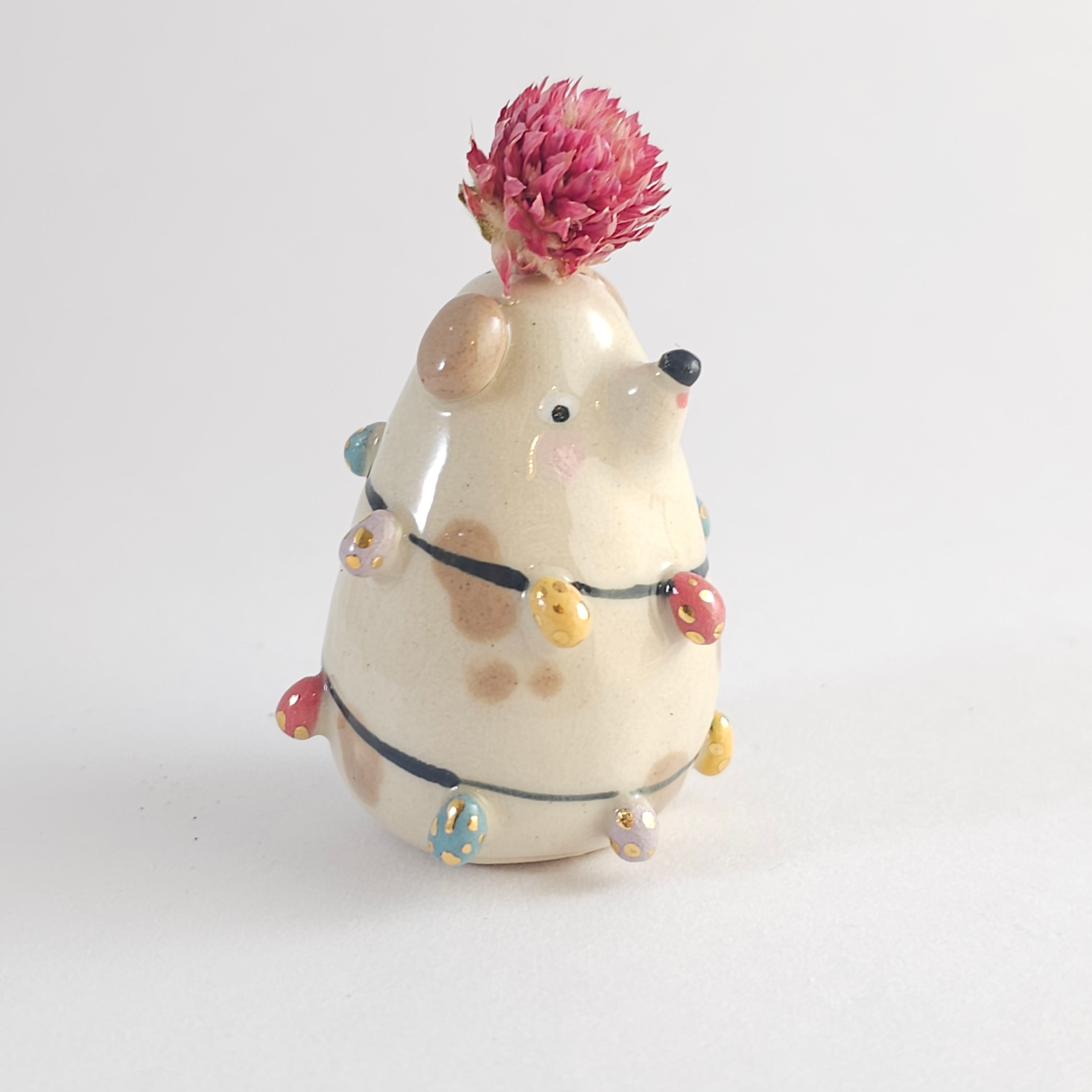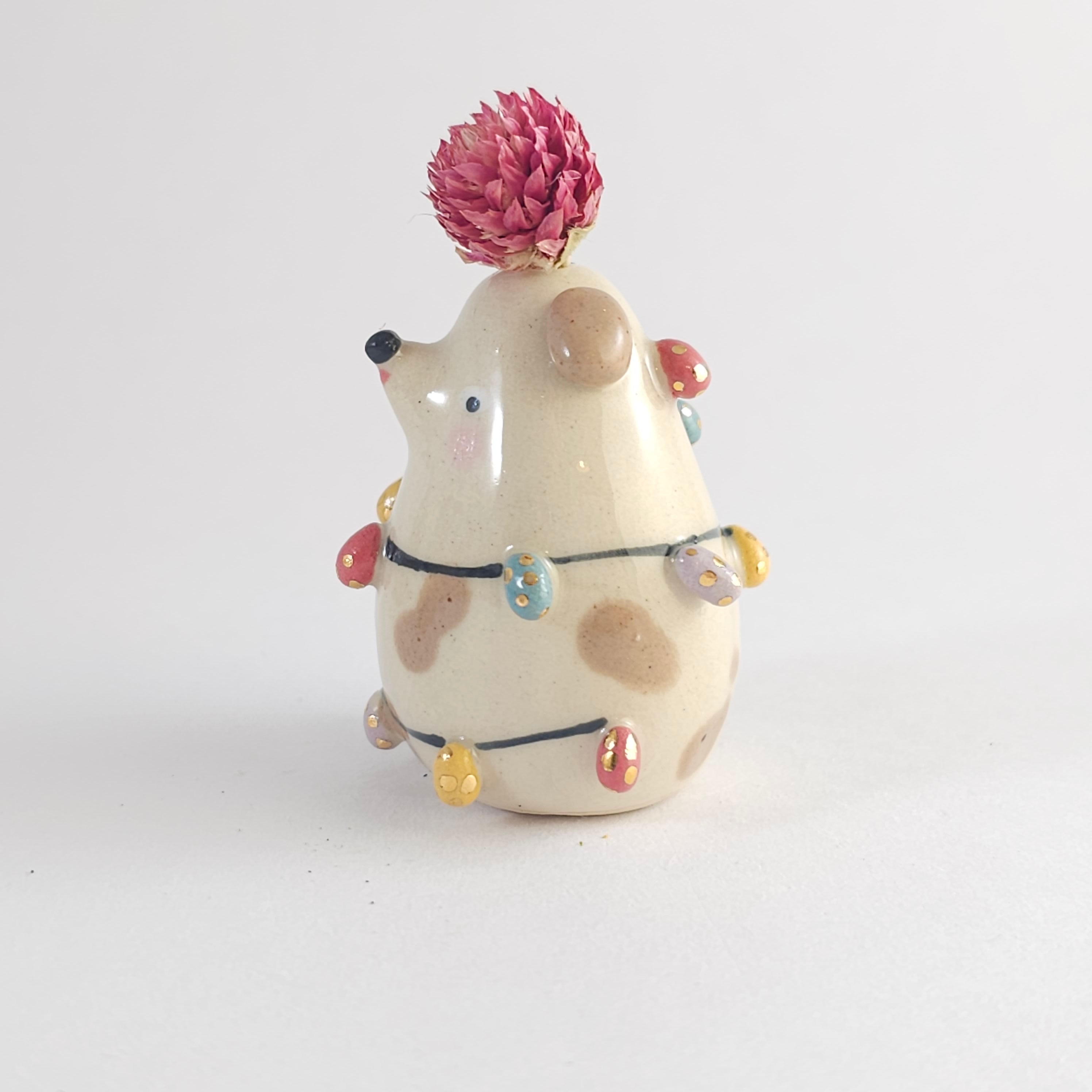 Small, hand built ceramic sculpture. Dipped in transparent glaze and covered with Gold Luster details.