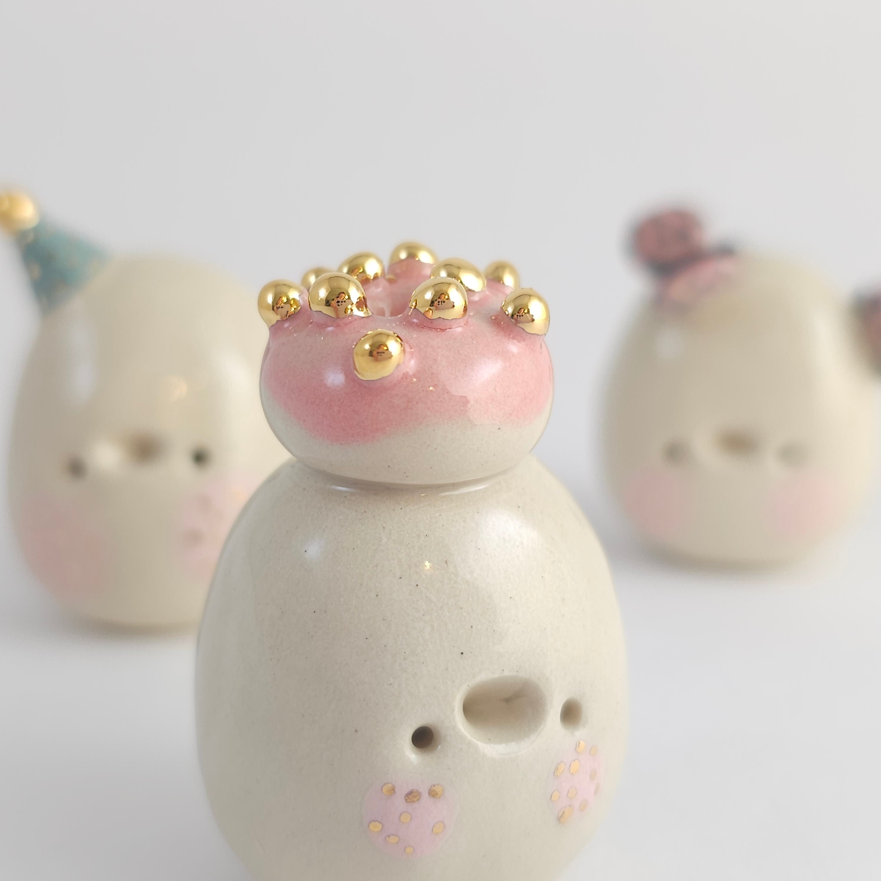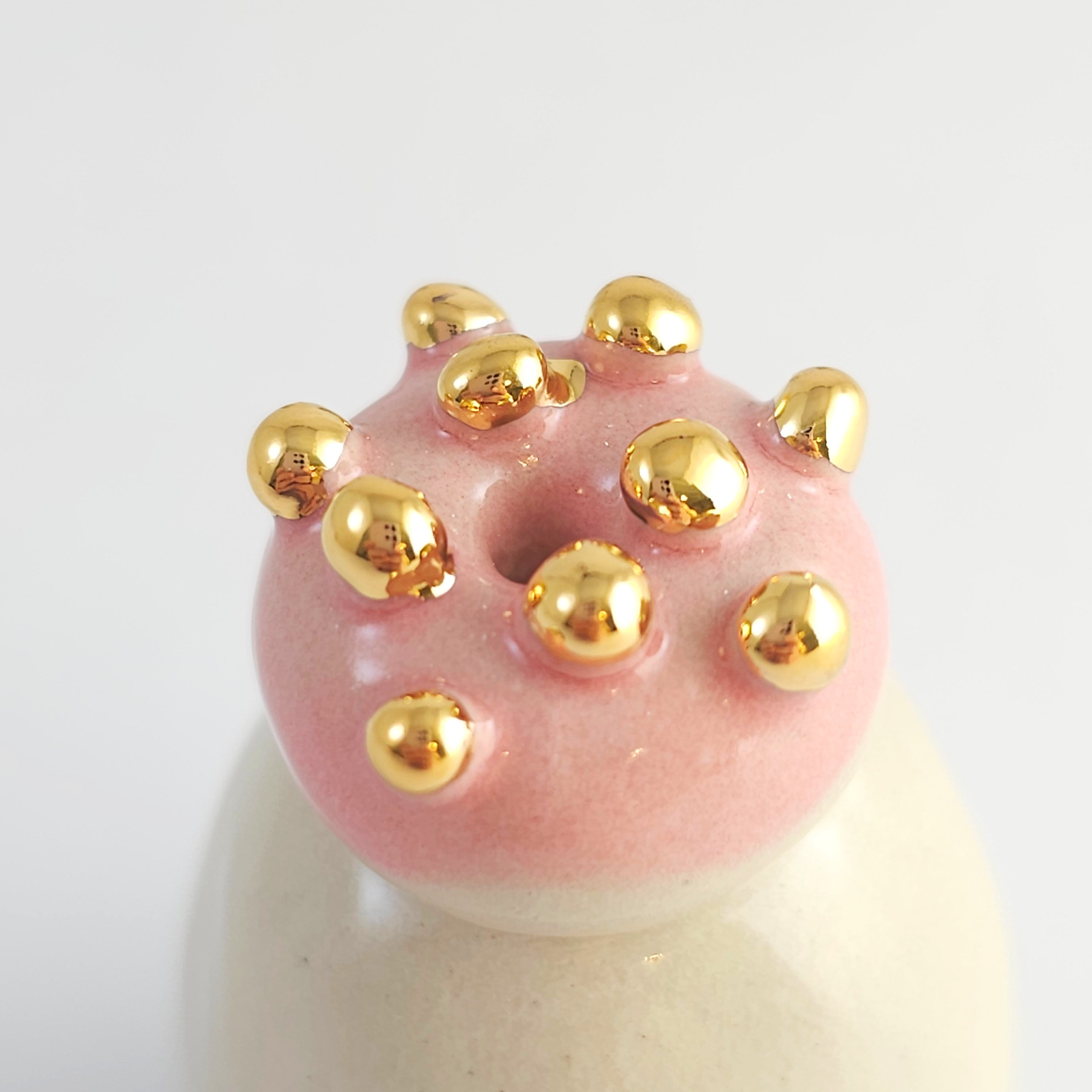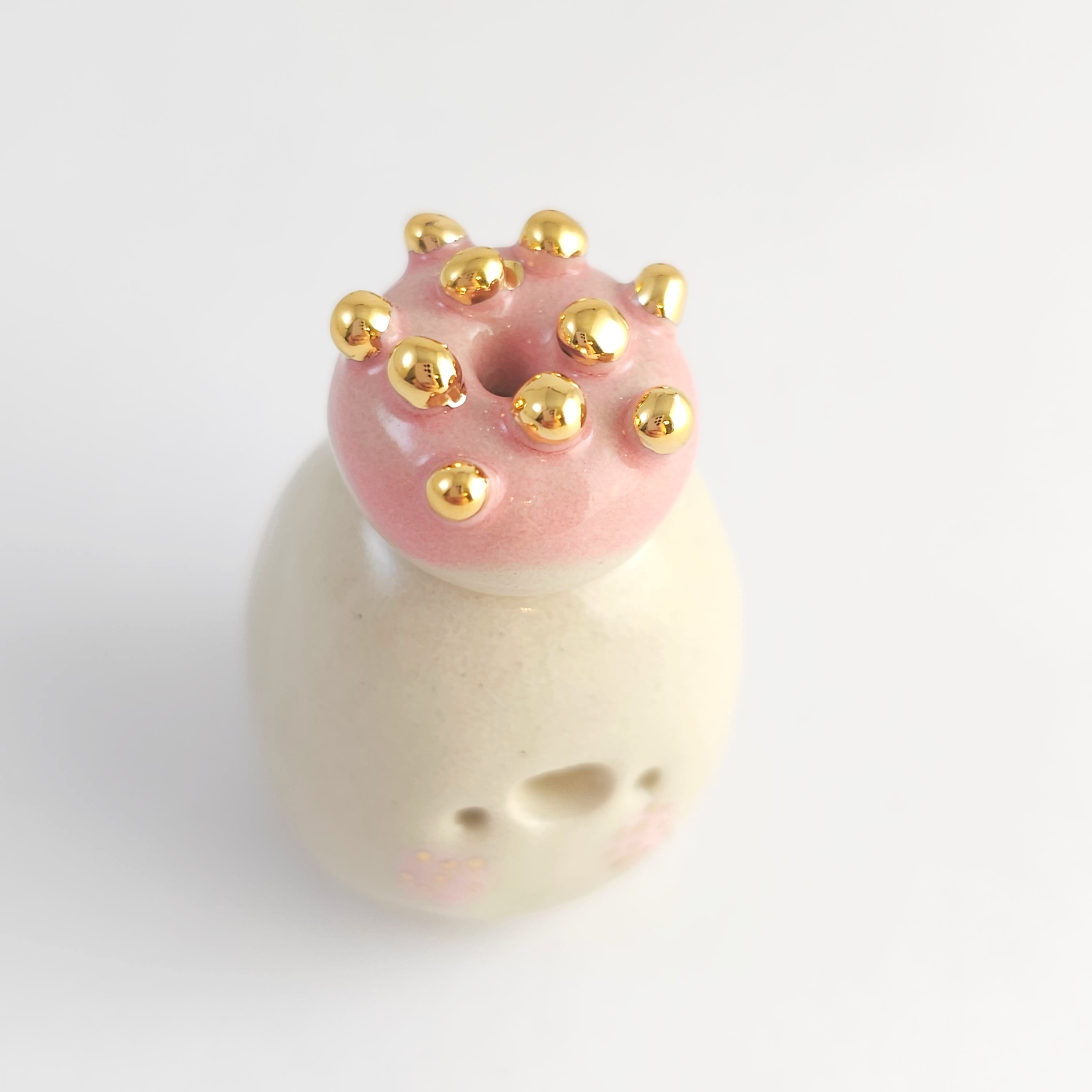 Small, hand built ceramic sculpture with gold luster details