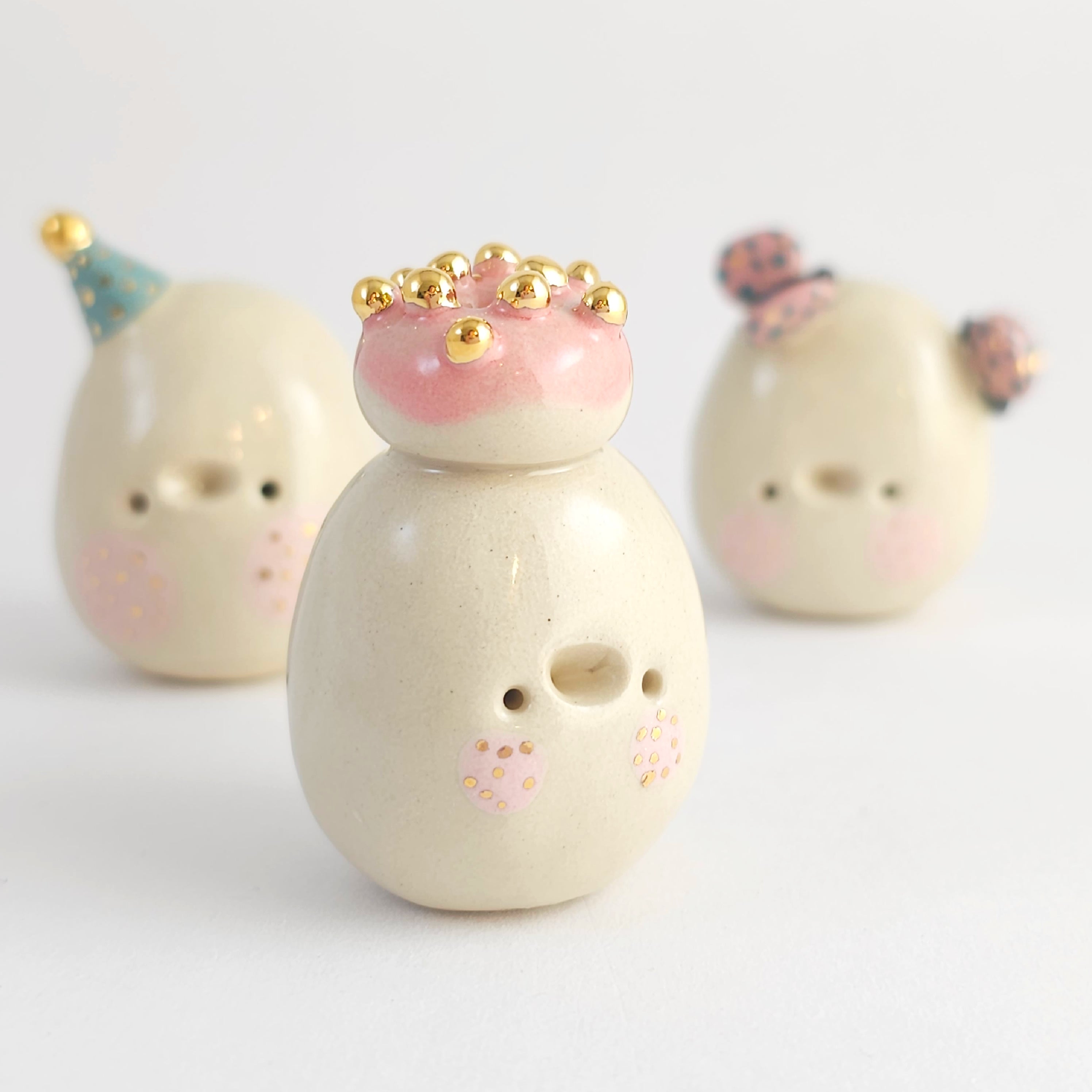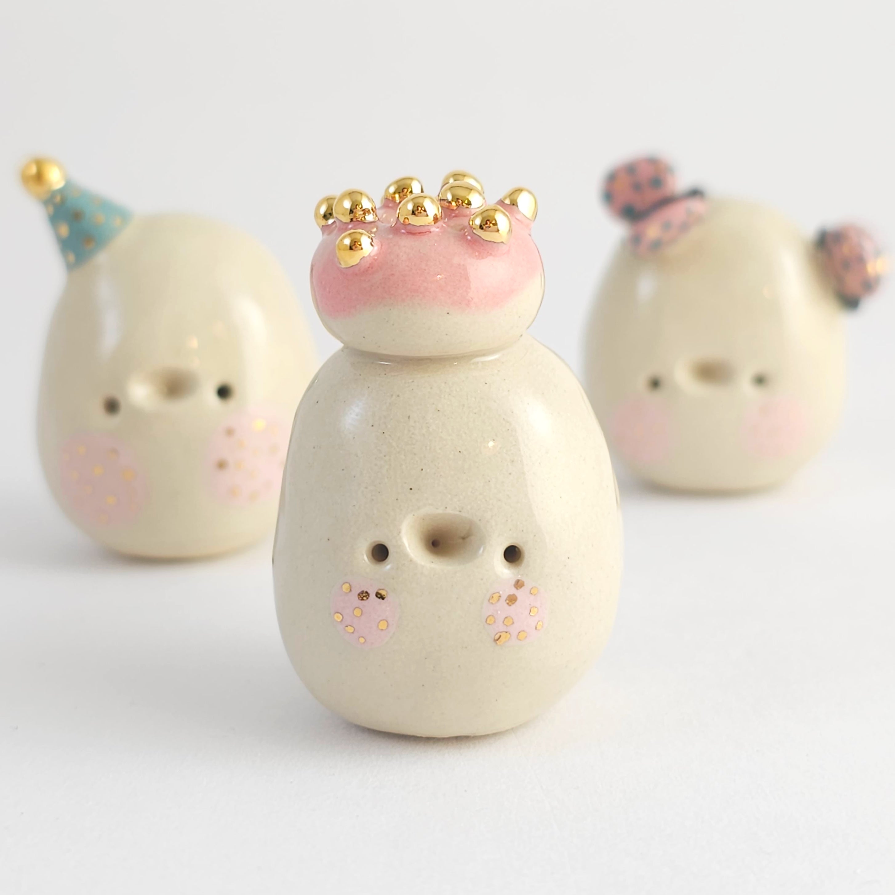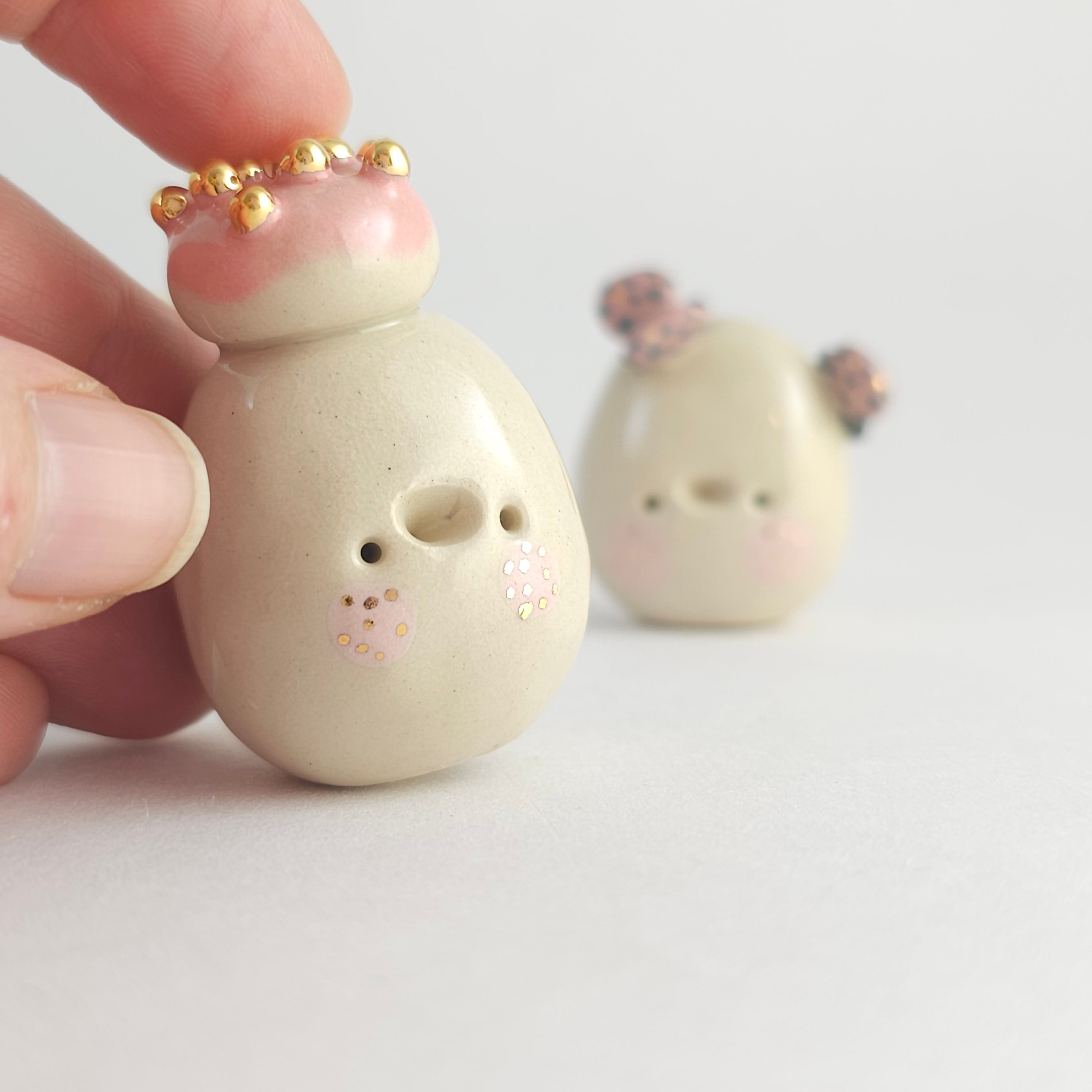 Small, hand built ceramic sculpture with gold luster details