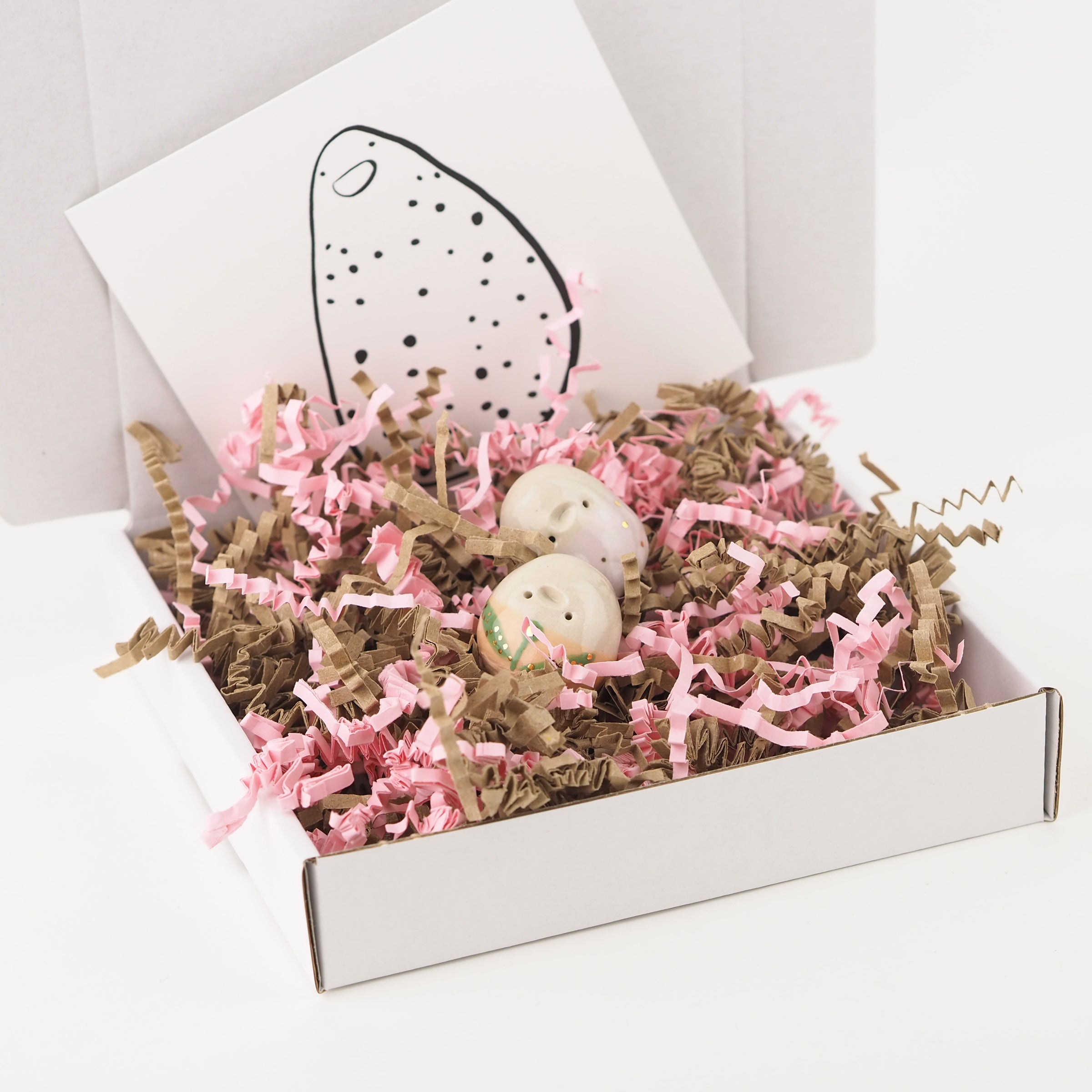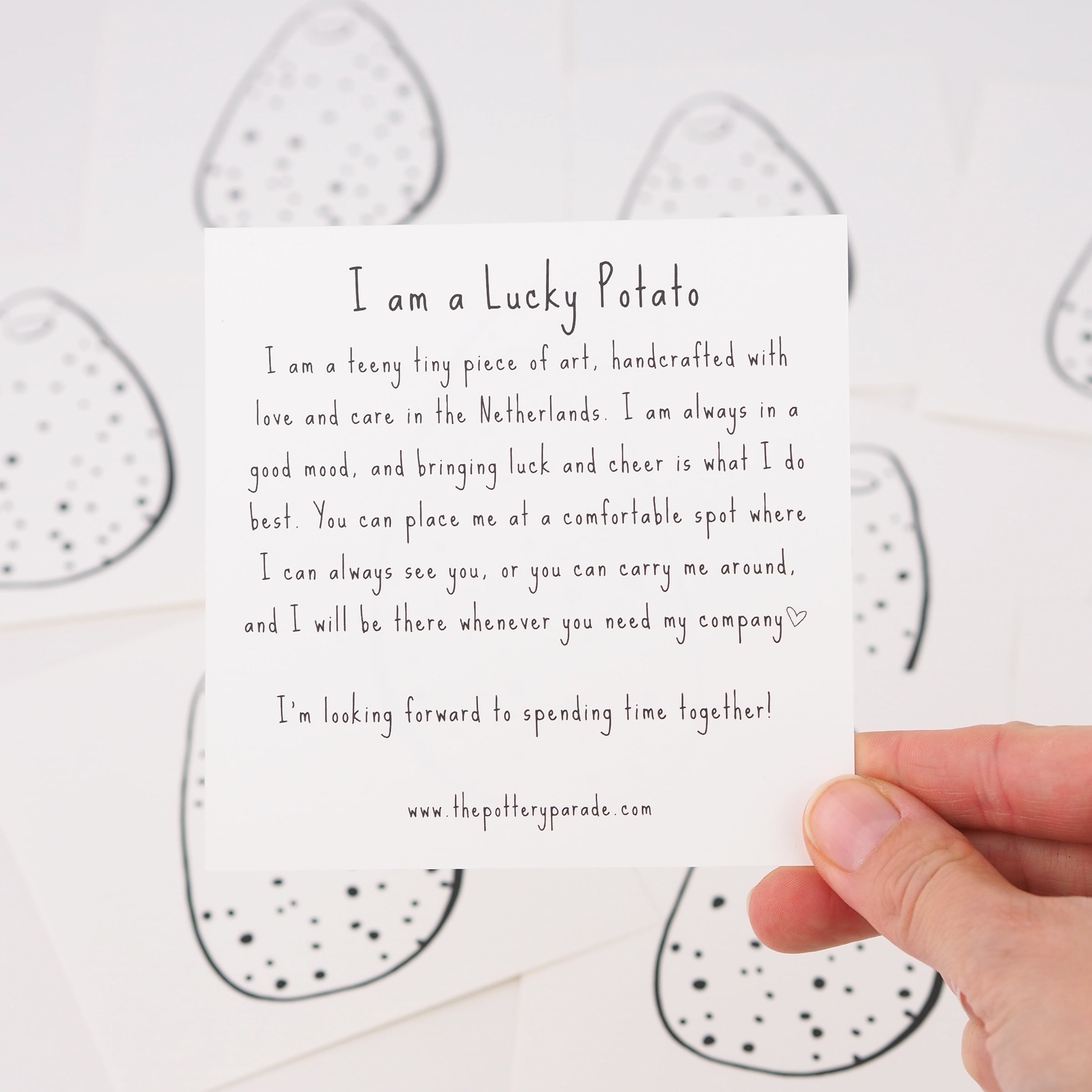 Lucky potatoes are small, handmade sculptures, made to bring luck and cheer to whoever owns them. Each potato includes an illustrated card with a small description (see image), making them great pieces to gift (or to keep to yourself:)