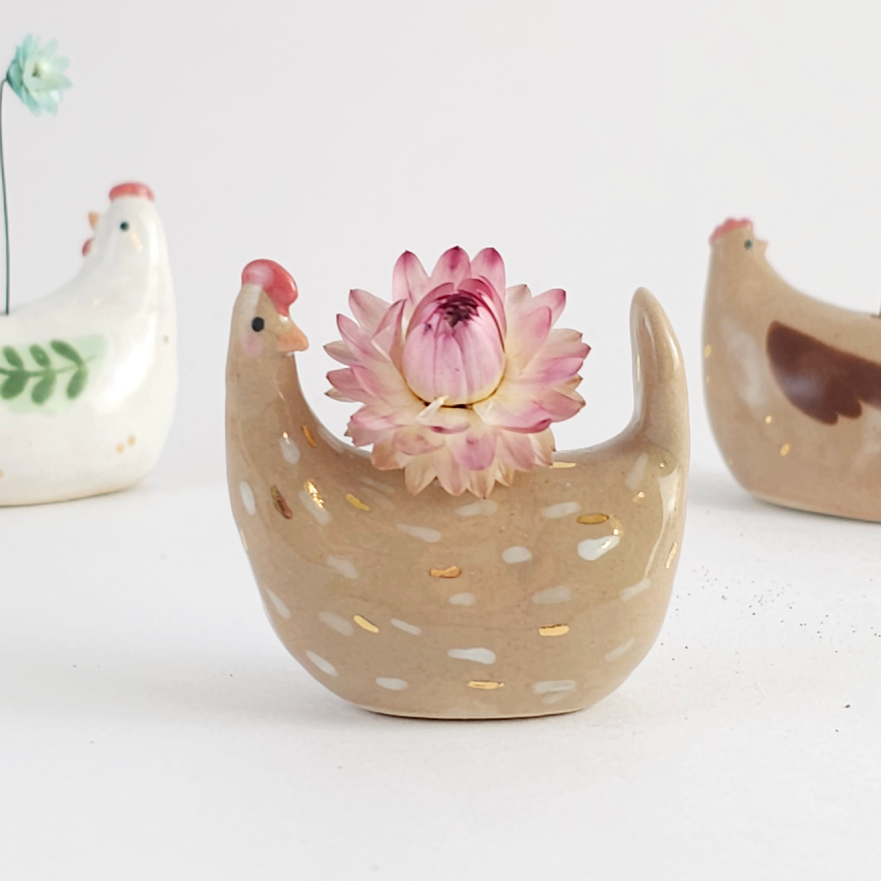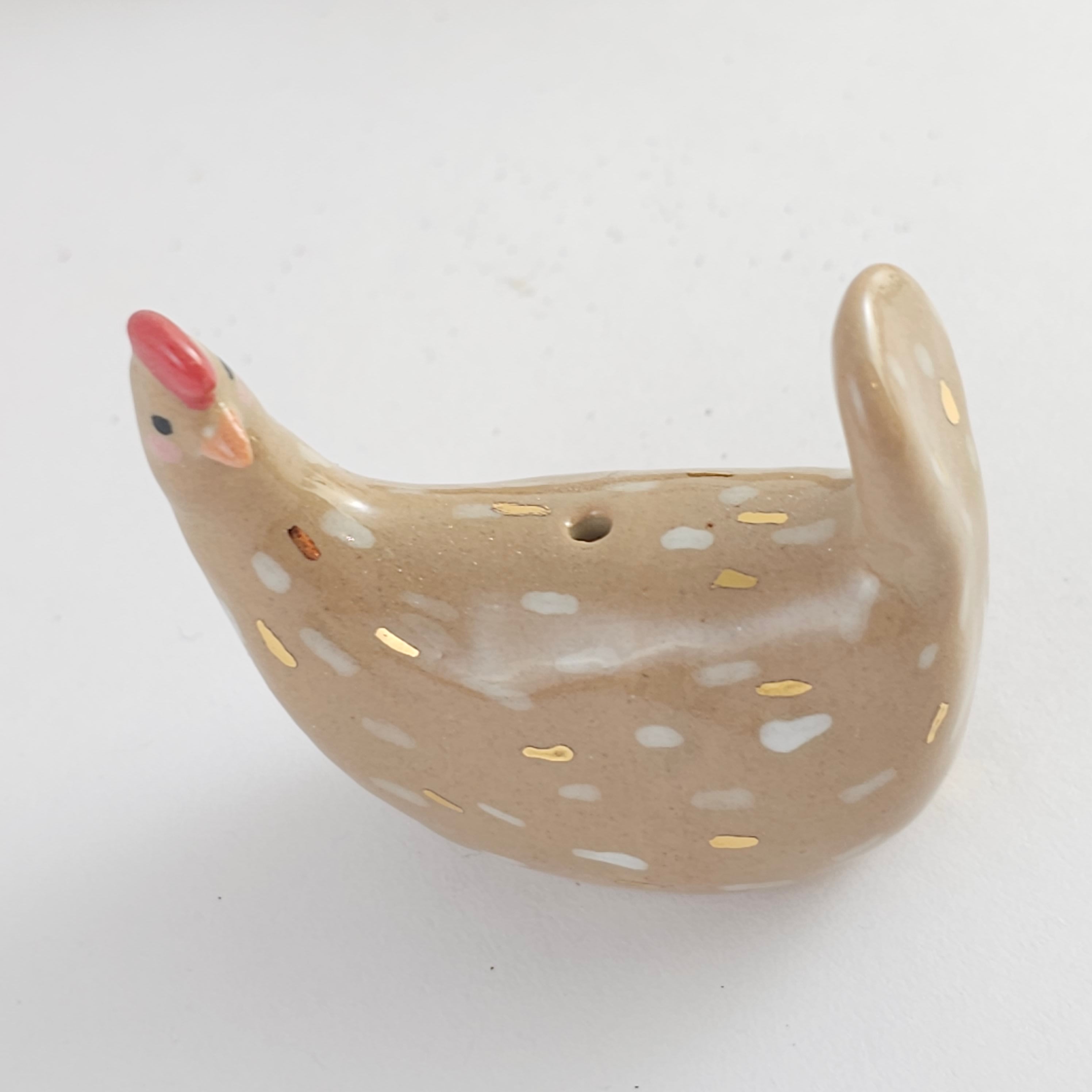 Small, hand built ceramic sculpture. Dipped in transparent glaze and covered with 24-carat Gold Luster details. Has a small hole on top to carry dry flowers.
