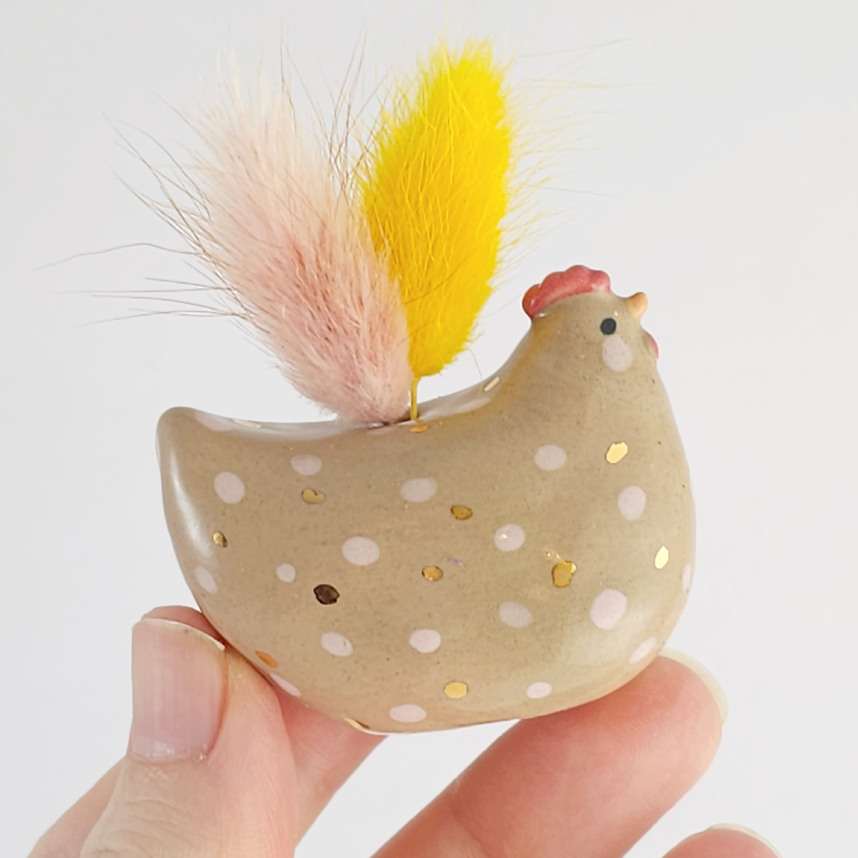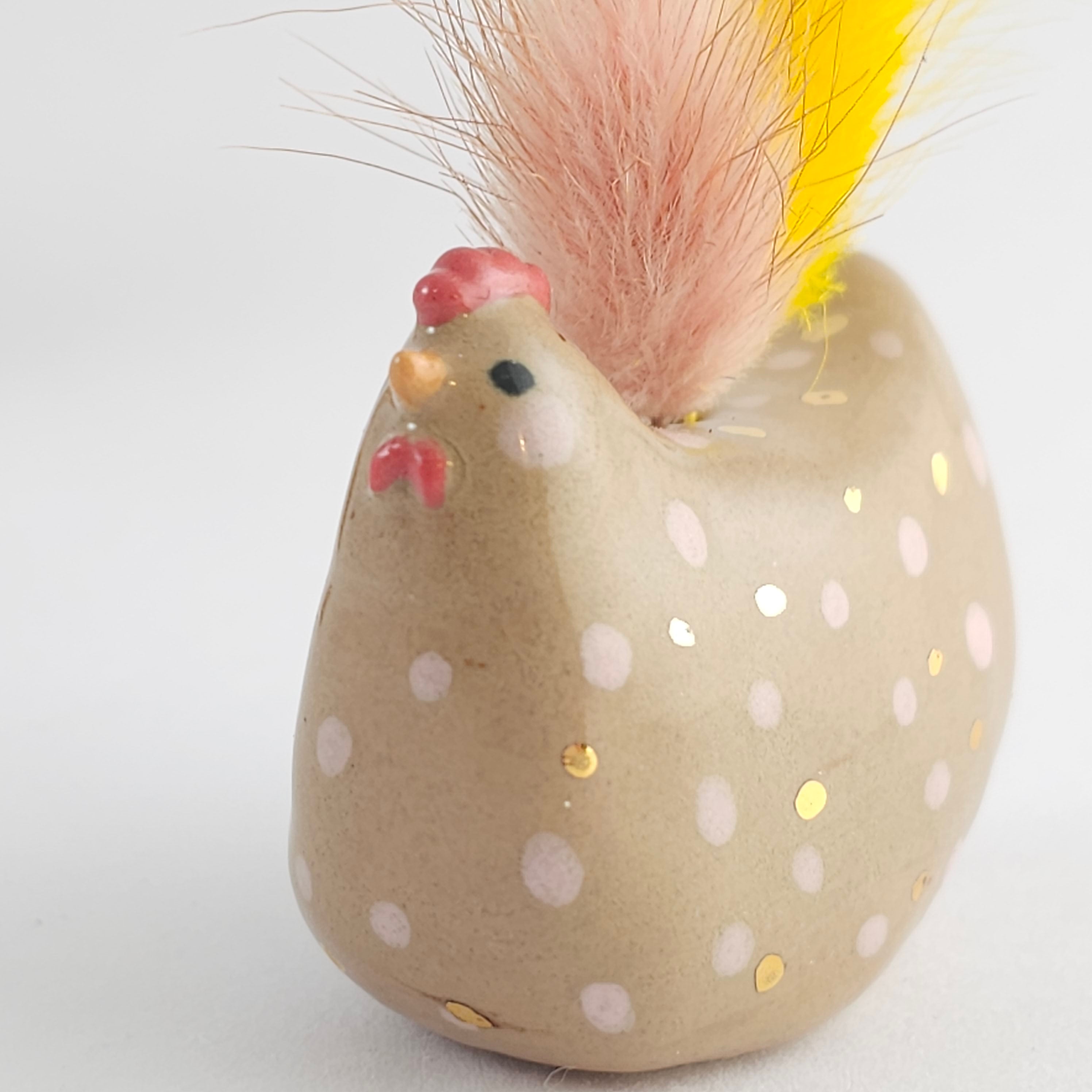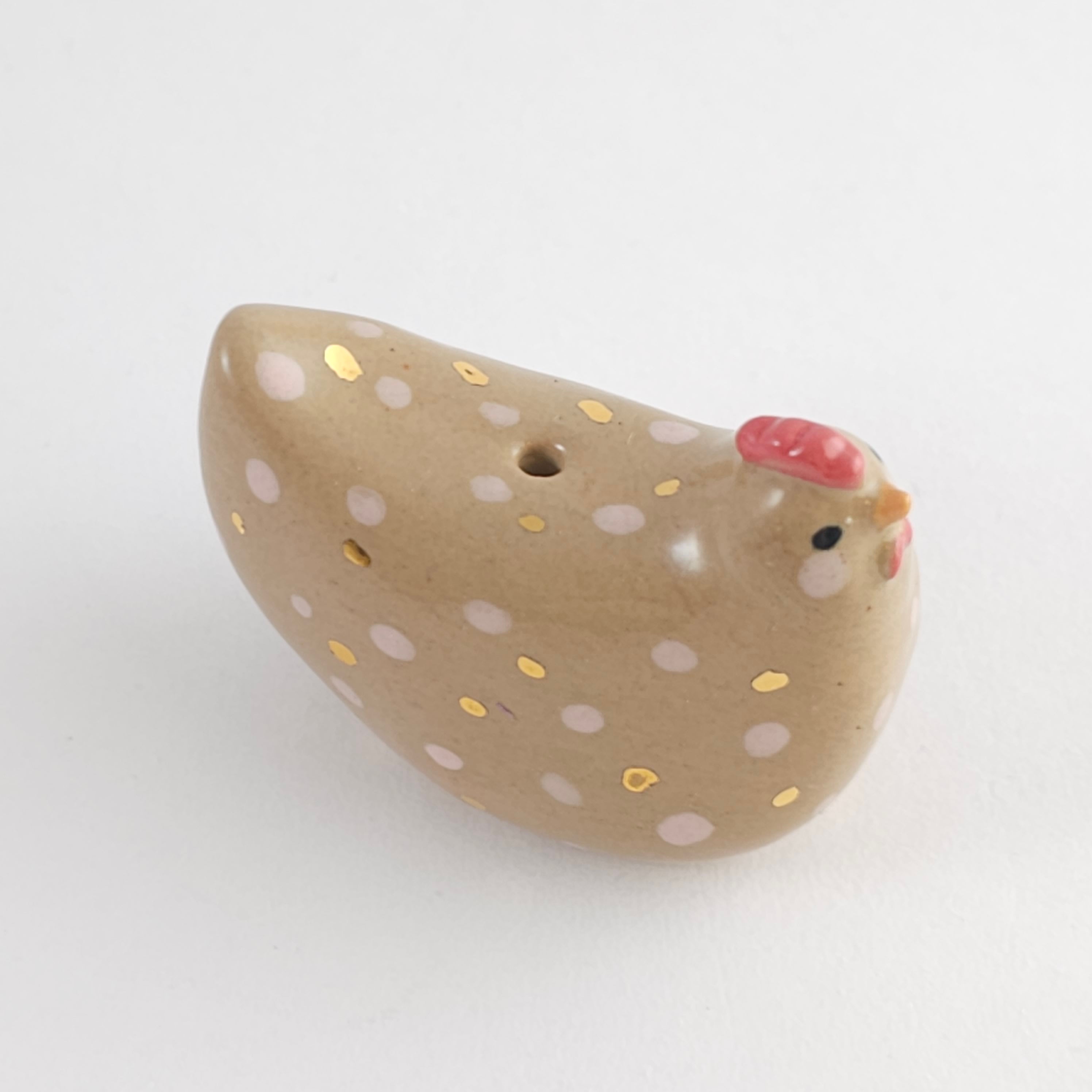 Small, hand built ceramic sculpture. Dipped in transparent glaze and covered with 24-carat Gold Luster details. Has a small hole on top to carry dry flowers.