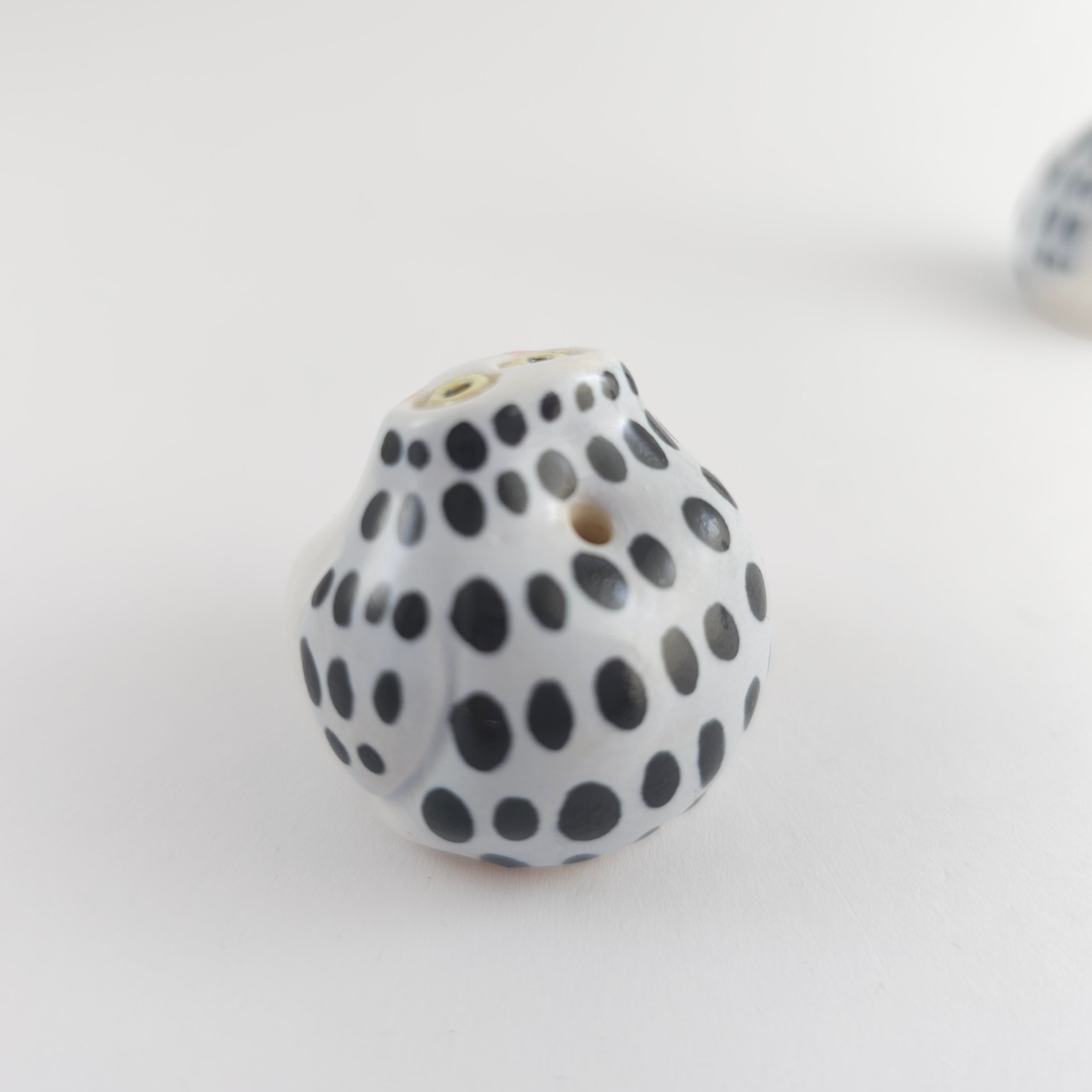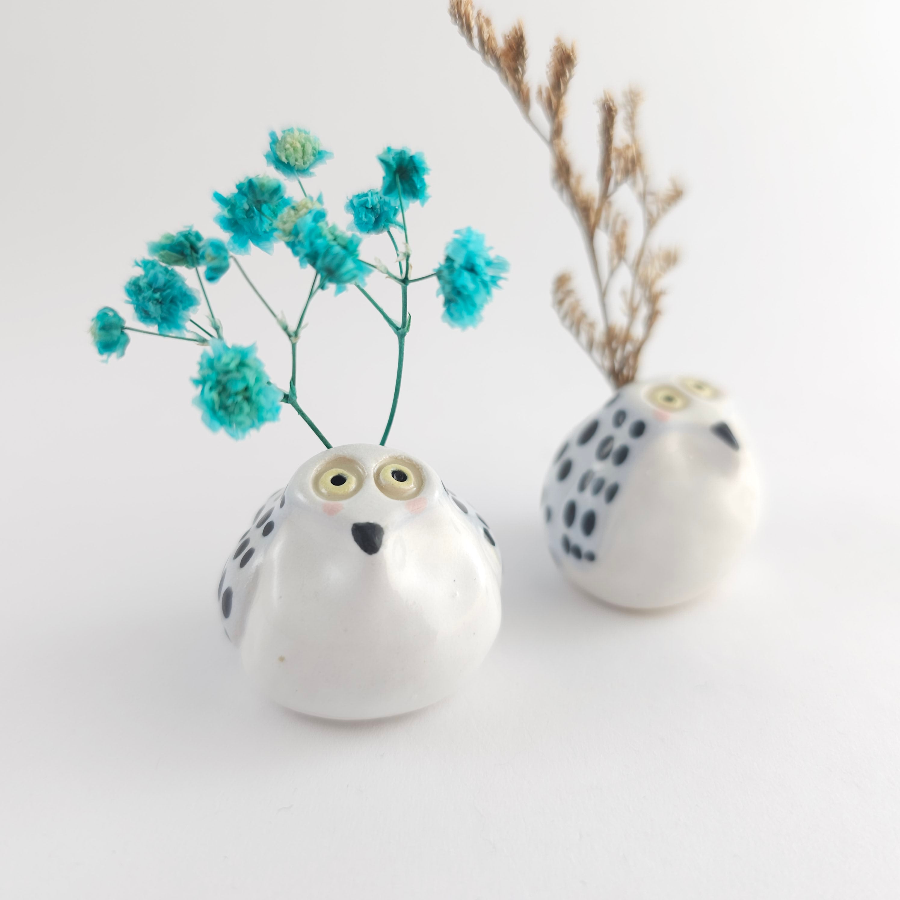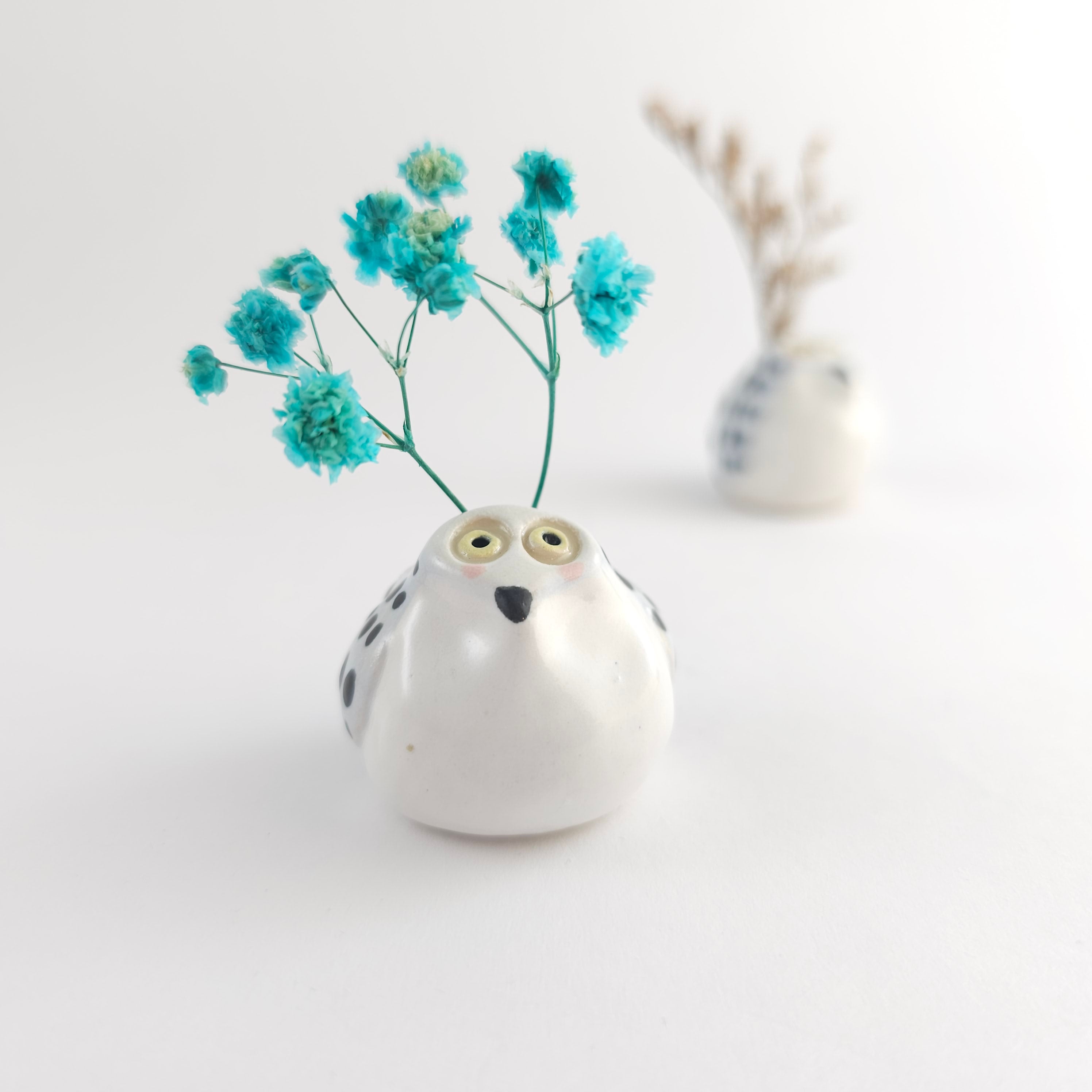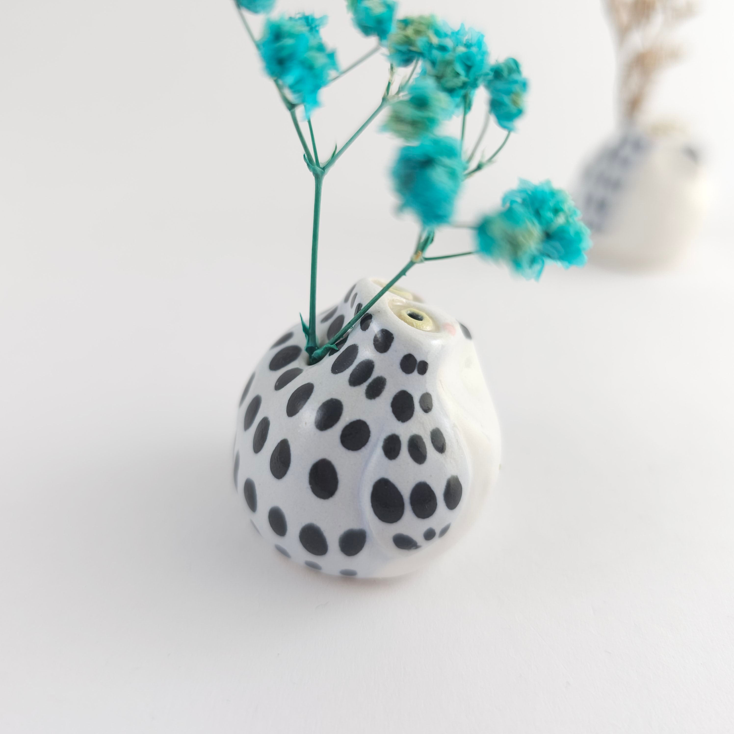 Small, hand built ceramic sculpture. Has a hole on top where dry flowers can be placed.