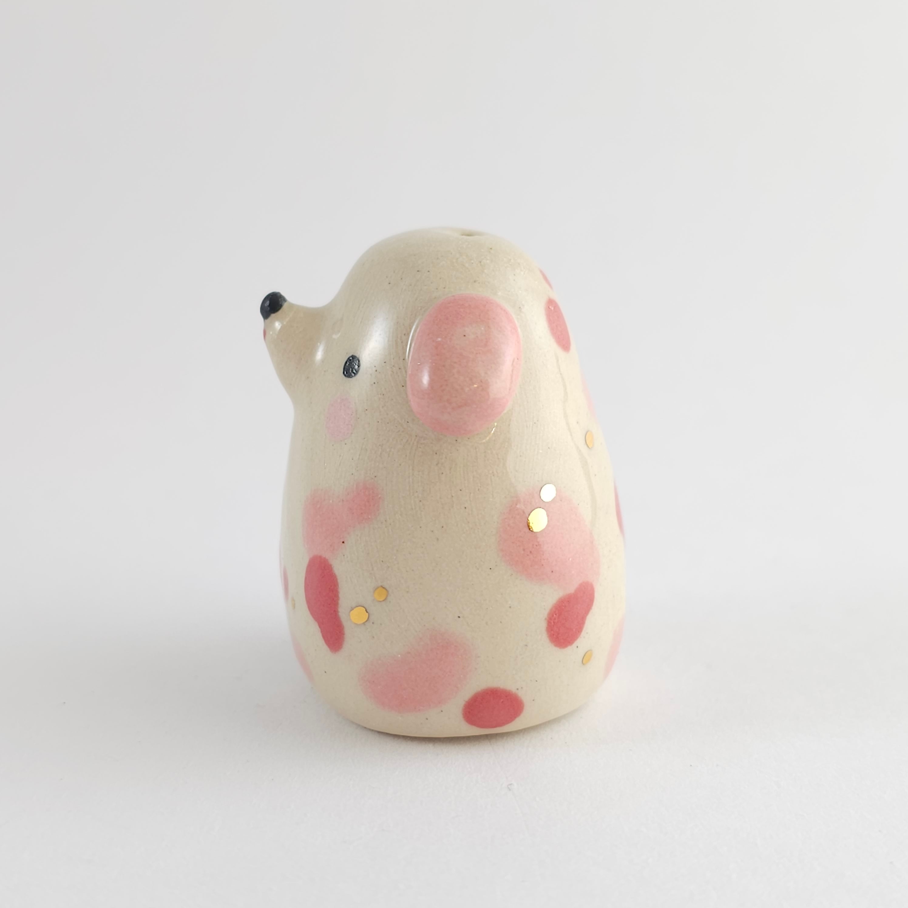 Small, hand built ceramic sculpture. Dipped in transparent glaze and covered with Gold Luster details.