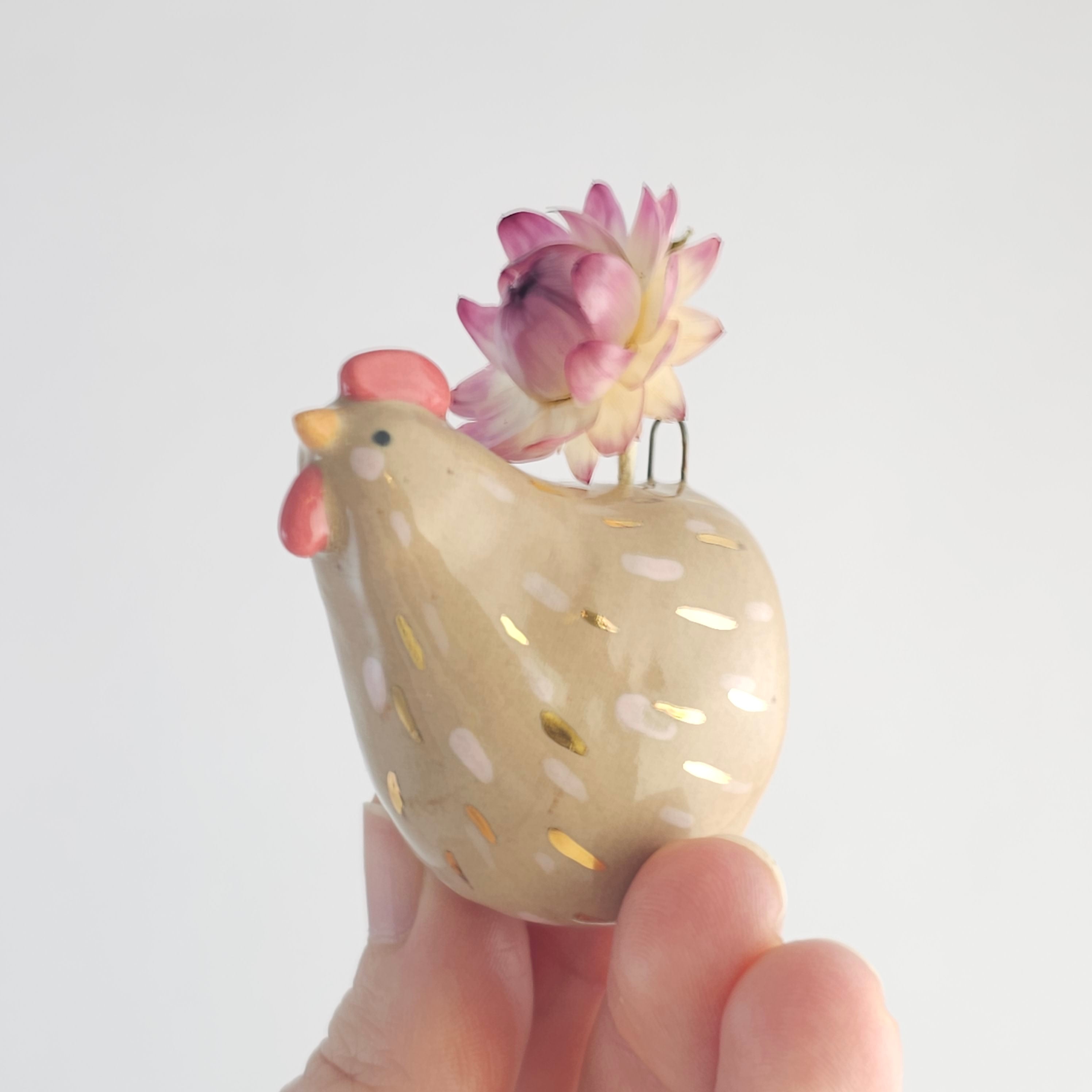 Small, hand built ceramic wall sculpture with flower holes on top. Covered with 24-carat gold luster details.