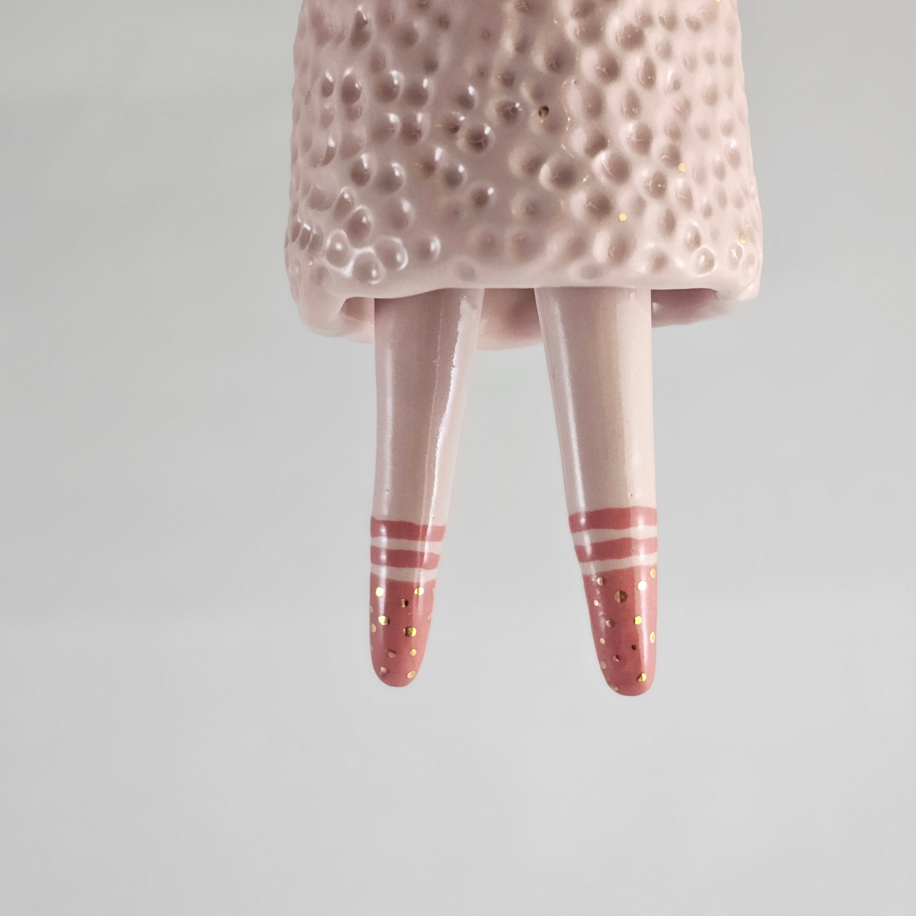 Hand built & hand painted ceramic bell, dipped in a transparent glaze and covered with 24-carat gold luster details. The little feet move separately from each other.