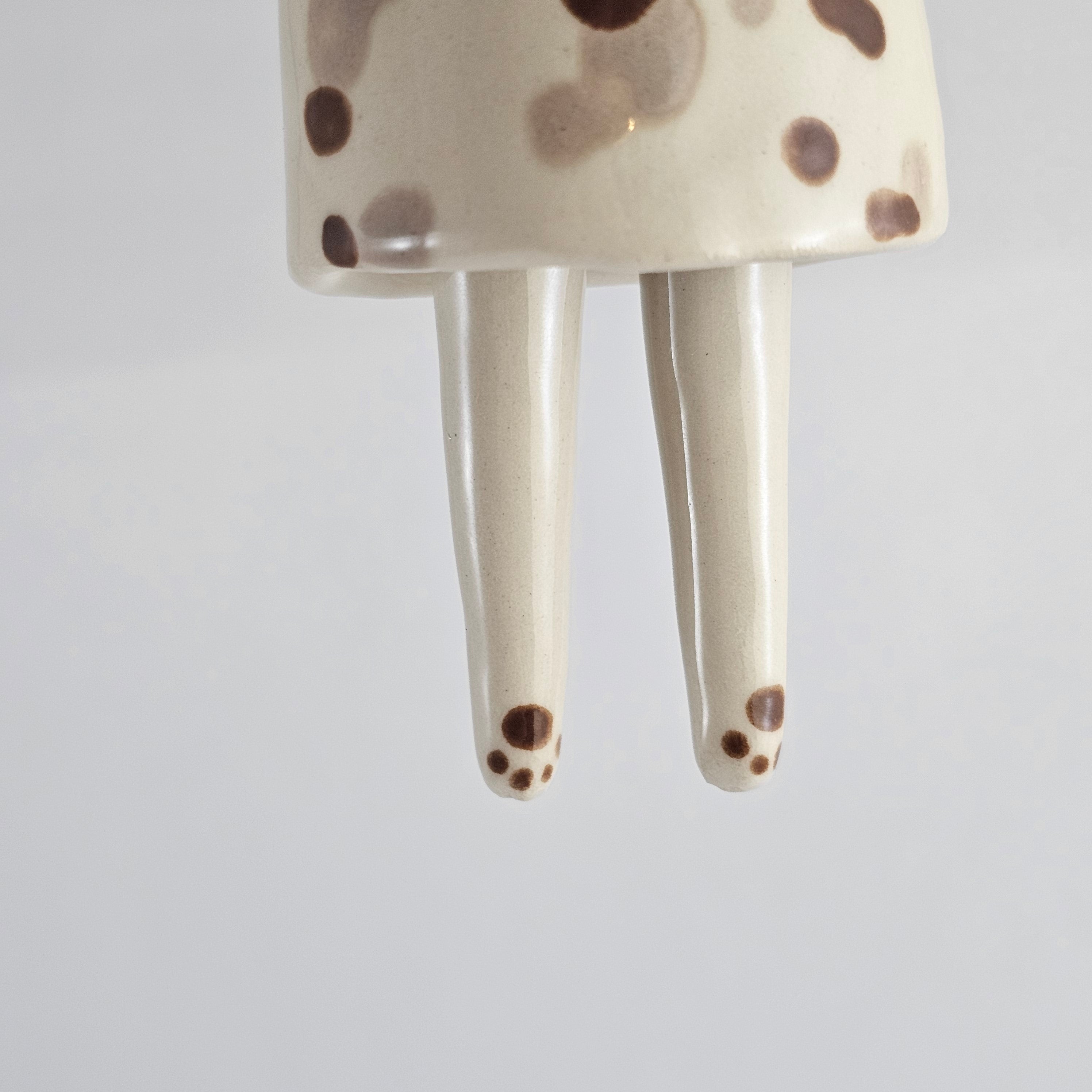 Hand built & hand painted ceramic bell, dipped in a transparent glaze. The little feet move separately from each other.