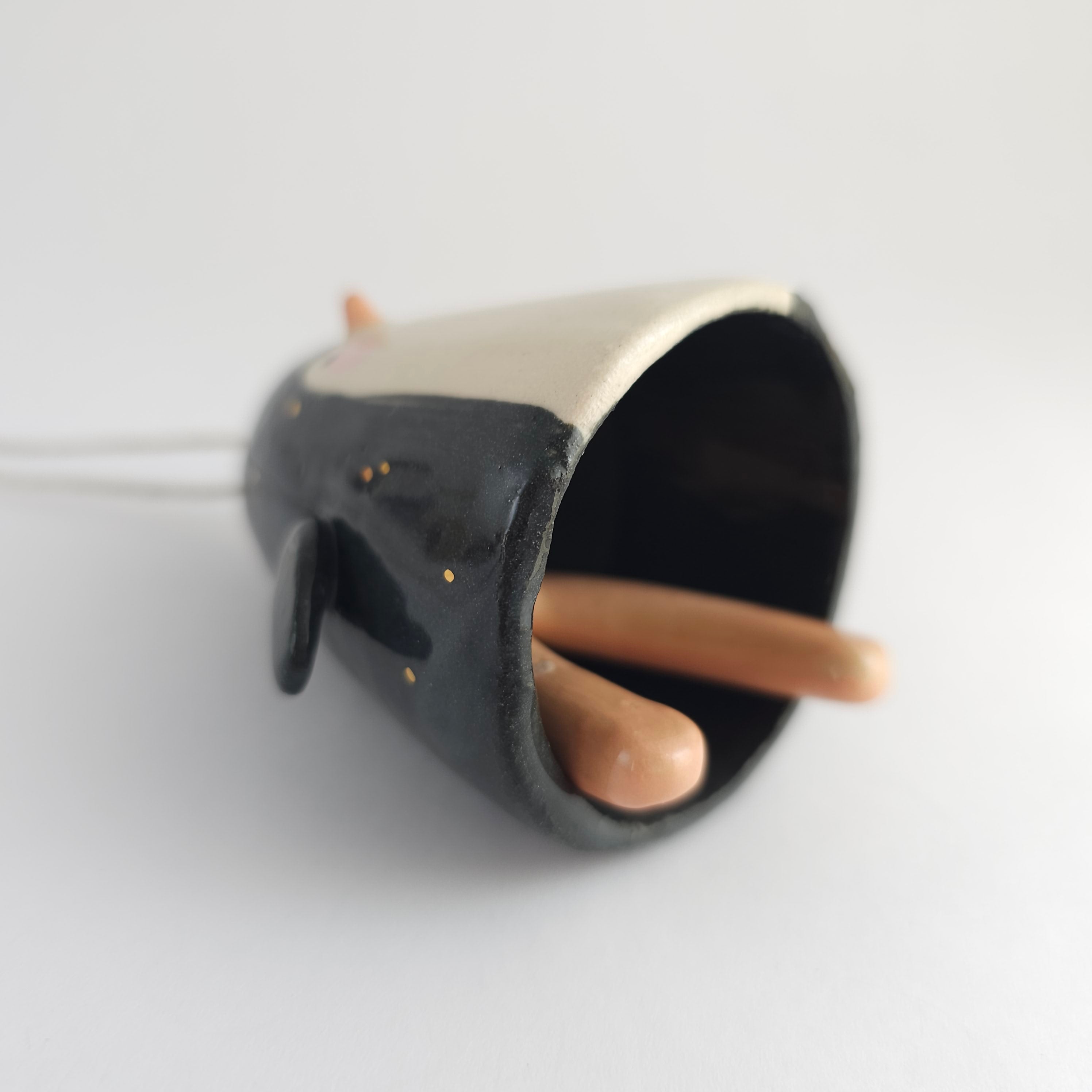This bell is one of my first pieces in a series where I explore the techniques of creating ceramic bells. The little feet are a one-piece clapper that's firmly attached to a rope. Note that the left foot of the penguin has a small mark.