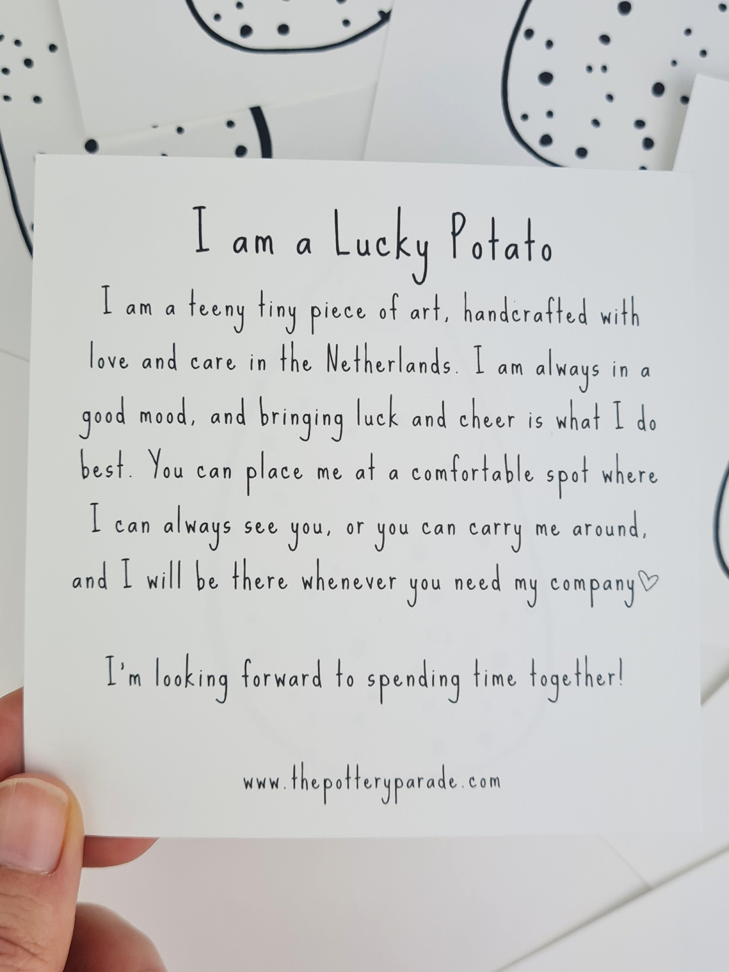 Lucky potatoes are small, handmade sculptures, made to bring luck and cheer to whoever owns them. Each potato includes an illustrated card with a small description (see image), making them great pieces to gift (or to keep to yourself:)